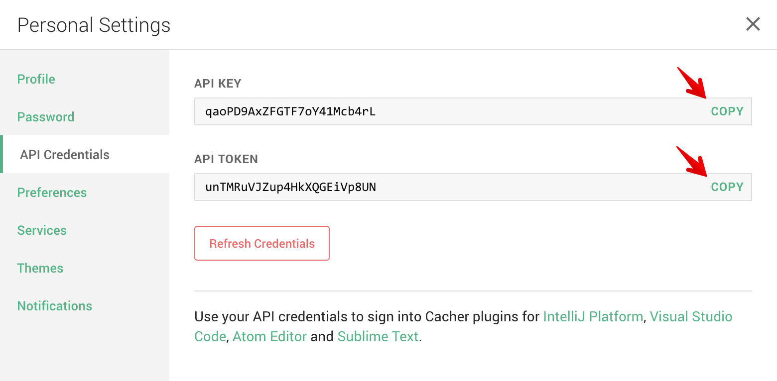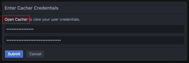 - In the prompt to "Enter Cacher Credentials", click the Open Cacher link to view your API credentials. You can also navigate to the page via: app.cacher.io/enter?action=view_api_creds