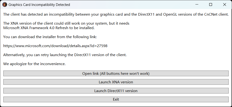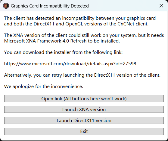 This dialog is launched by the dialog test, because it is hard to reproduce the incompatibility just in order to show the prompt. The only difference is the dialog launched by the dialog test will not do anything and has a