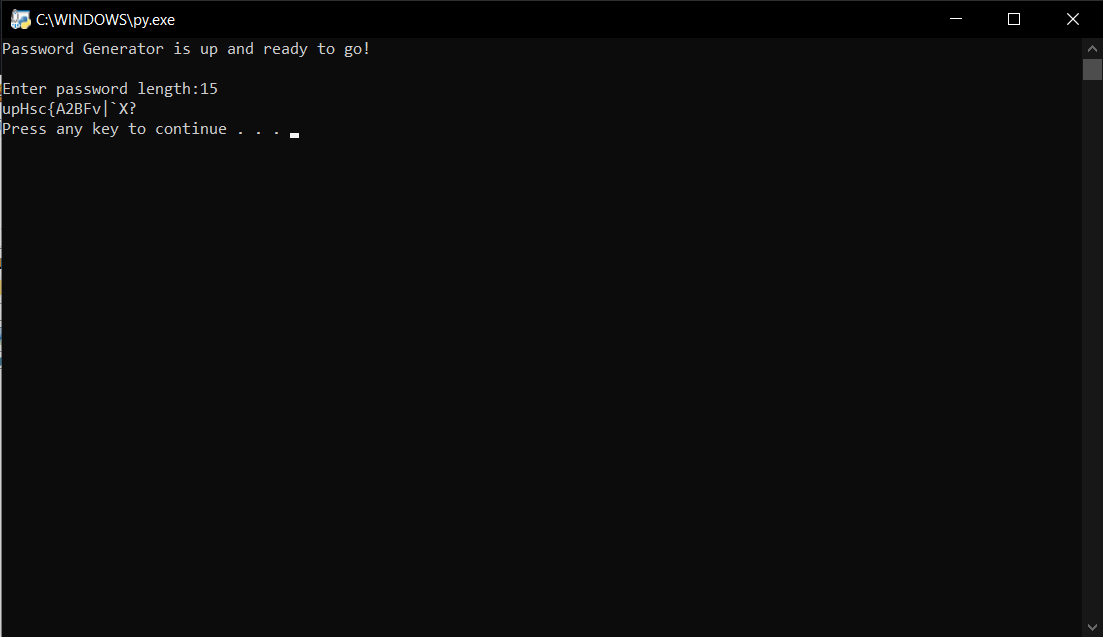 The program will generate a random password with the specified length. Feel free to copy and paste it, and press any key to exit the program!
