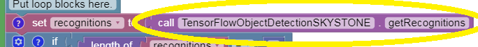 This Blocks Op Mode uses a Variable called 'recognitions'. This is a special variable holding multiple pieces of information, not just one number, or one text string, or one Boolean value. The yellow-circled command sets that variable to store the entire group of results passed from the TFOD method. You can think of ‘recognitions’ by an informal name such as “all recognitions in this evaluation”, or just “allRecognitions”.