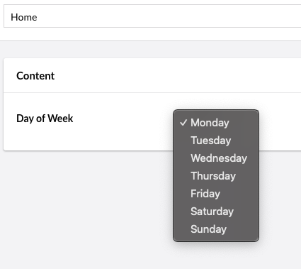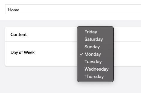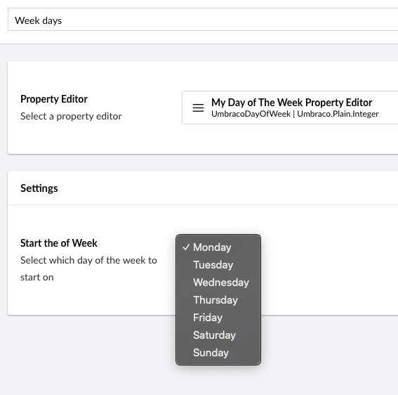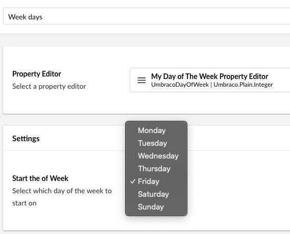 A simple dropdown property editor for content editors to select a day of the week, with configurable start day options.