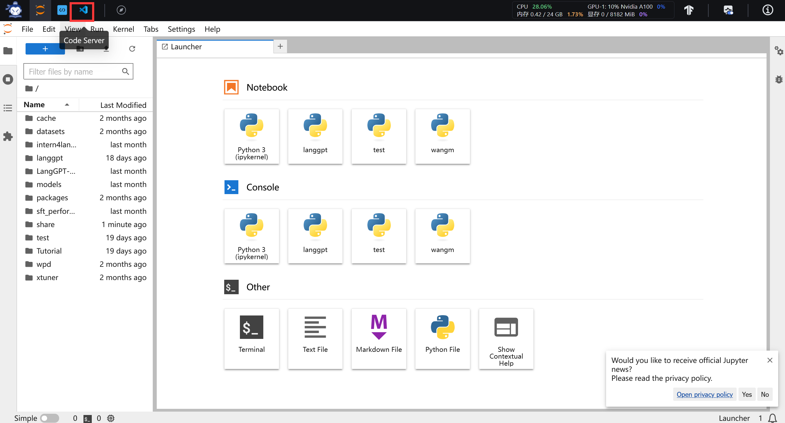 创建成功后点击进入开发机打开WebIDE。进入后在WebIDE的左上角有三个logo,依次表示JupyterLab、Terminal和Code Server,本节需要使用Terminal和Code Server。