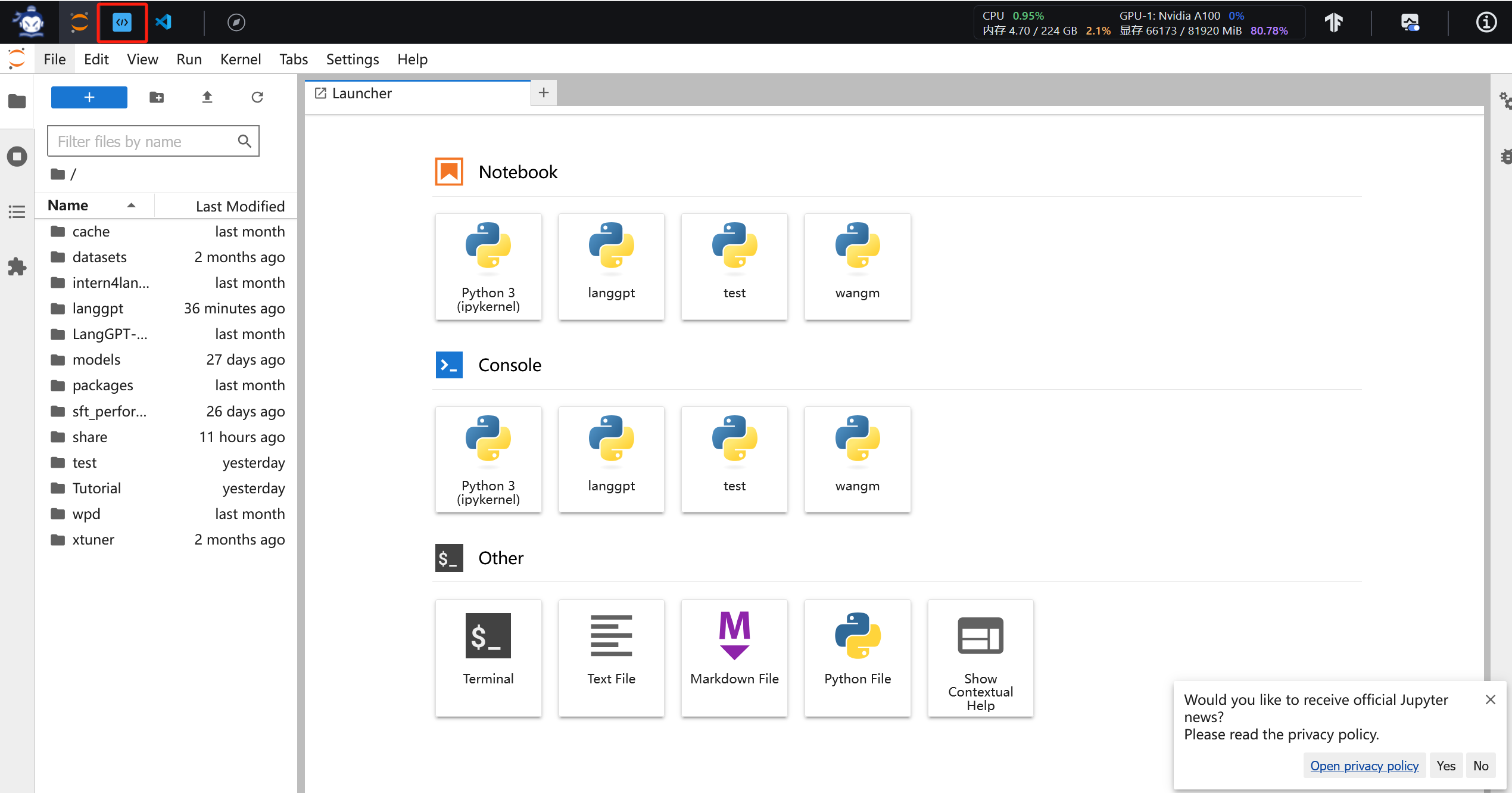 创建成功后点击进入开发机打开WebIDE。进入后在WebIDE的左上角有三个logo,依次表示JupyterLab、Terminal和Code Server,本节需要使用Terminal和Code Server。