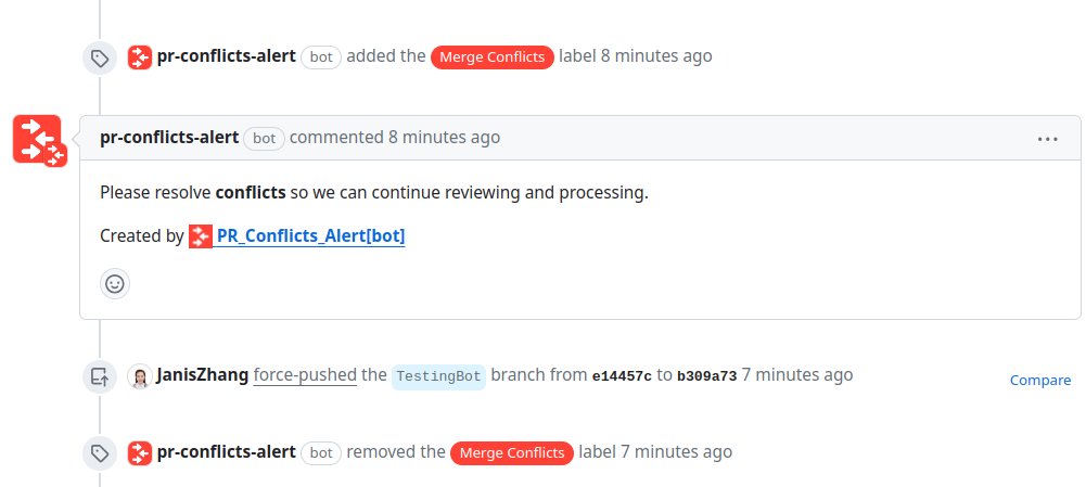 We often spend a lot of time manually checking for conflicts in many PRs. The PR Conflicts Alert GitHub App saves us that trouble. It labels and comments on PRs when they hit conflicts, then tidies up after the issues are resolved.