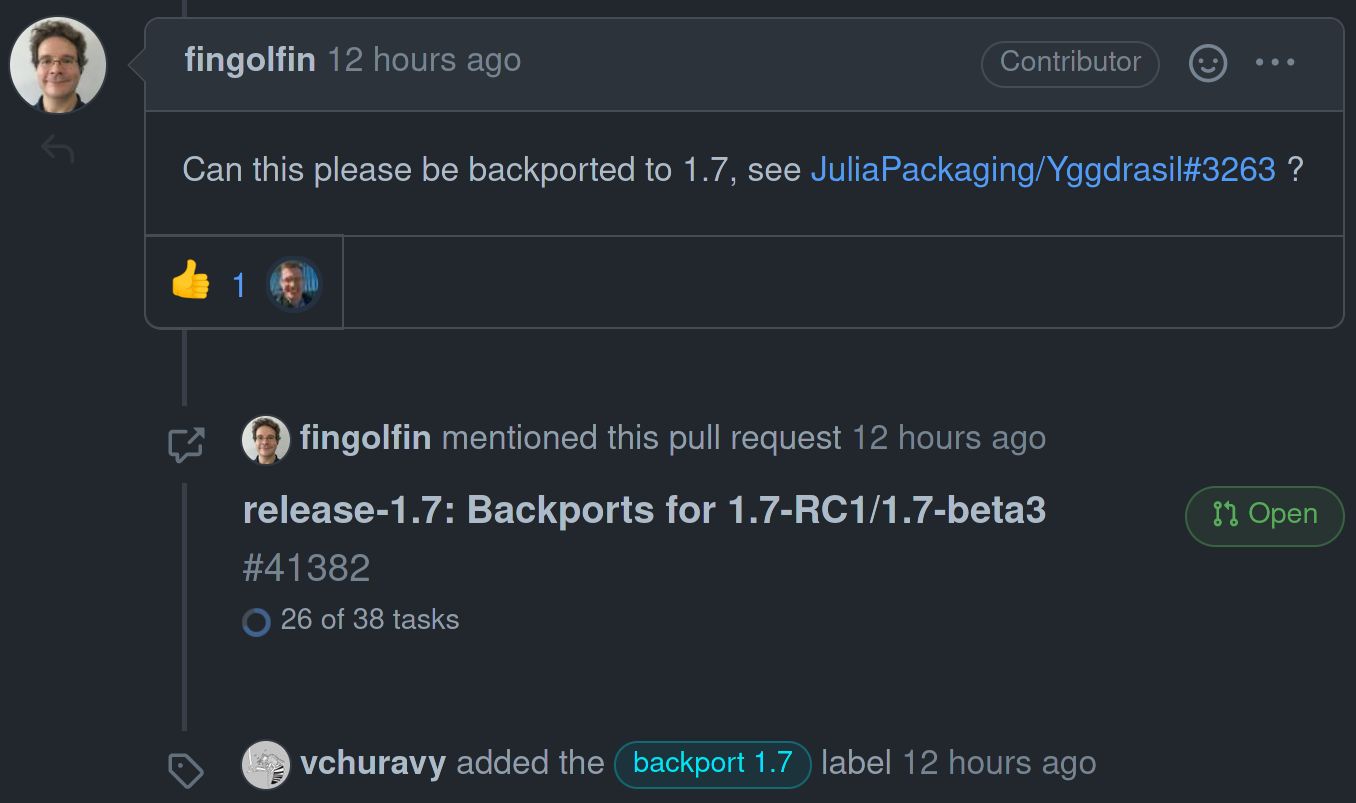 @benlorenz thanks for pointing that one out. It doesn't seem to be in JuliaLang/julia#41382 though -- I guess that'd we should ask for that, then. Will do |