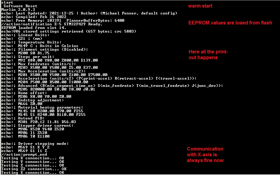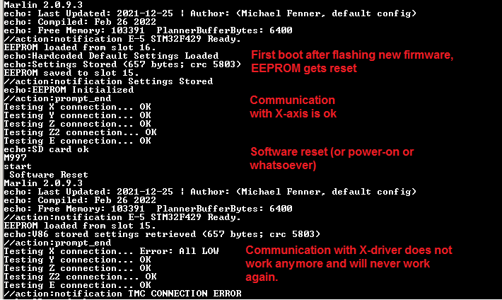 Here you see a start after flashing a new firmware (ok), followed by a software reset (X driver communication fails)