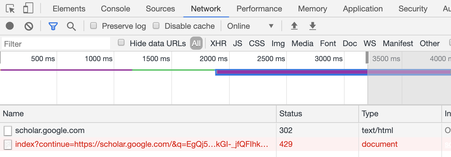 After a bit of investigation , I found this validation was redirected (with status code 302) from google scholar page (https://scholar.google.com) to google warning page (https://www.google.com/sorry/index?continue=XXX) while the status code changed to 429.