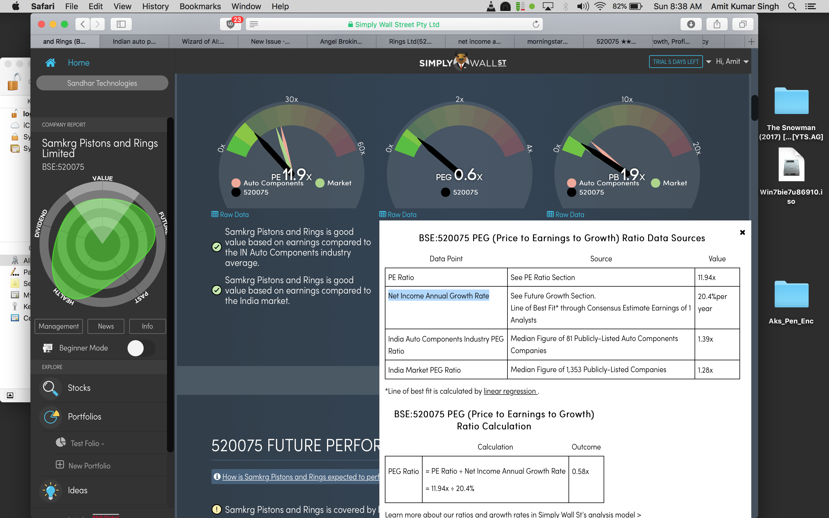 The PEG Scores of stocks are differing with other credible sites . Case in point Company 520075 shows a >1 PEG at screener.in but in simply wall st. the same stock is showing .6