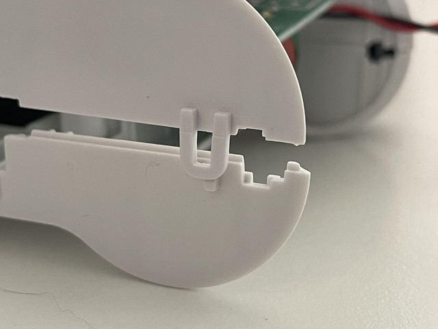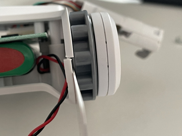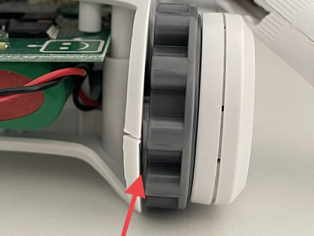 - Take a plastic card (e.g. credit card) and insert it between the wheels and the body on all 4 sides. There are plastic clips there which are hard to see. Insert the card on all 4 sides with a bottom to top motion. When you unclip those the body will split in two.