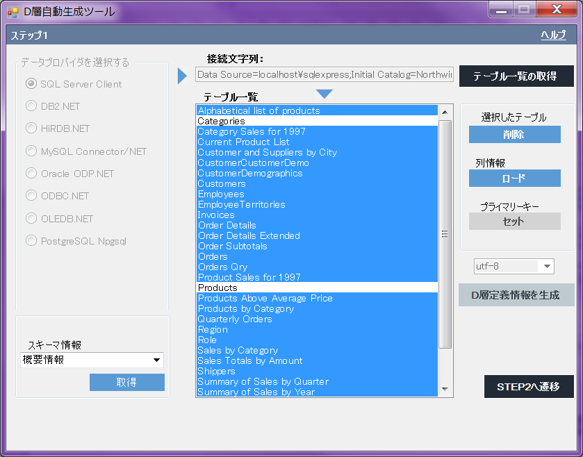 Tables and views in Northwind database are shown in list box. Since Categories table and Products table, and from TABL1 table to TABL6 table will be used in this tutorial, select all tables and views except these tables, and click Delete.