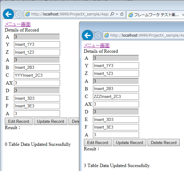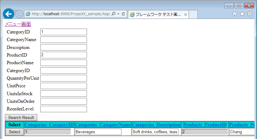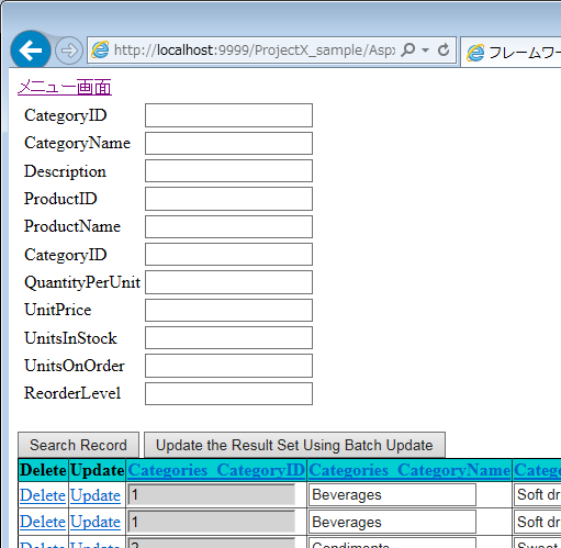 Internally, Products table and Categories table are updated. Users can confirm by the sql trace log.[2016/12/02 11:59:39,908],[INFO ],[8],22,0,[commandText]: -- DaoProducts_S3_Update -- 2016/12/1 日立 太郎 UPDATE [Products] SET [ProductName] = @Set_ProductName_forUPD, [CategoryID] = @Set_CategoryID_forUPD, [QuantityPerUnit] = @Set_QuantityPerUnit_forUPD, [UnitPrice] = @Set_UnitPrice_forUPD, [UnitsInStock] = @Set_UnitsInStock_forUPD, [UnitsOnOrder] = @Set_UnitsOnOrder_forUPD, [ReorderLevel] = @Set_ReorderLevel_forUPD WHERE [ProductID] = @ProductID [commandParameter]:ProductID=2,CategoryID=1,Set_ProductName_forUPD=Chang,Set_CategoryID_forUPD=1,Set_QuantityPerUnit_forUPD=24 - 12 oz bottles,Set_UnitPrice_forUPD=20,Set_UnitsInStock_forUPD=17,Set_UnitsOnOrder_forUPD=40,Set_ReorderLevel_forUPD=25, [2016/12/02 11:59:39,924],[INFO ],[8],3,0,[commandText]: -- DaoCategories_S3_Update -- 2016/12/1 日立 太郎 UPDATE [Categories] SET [CategoryName] = @Set_CategoryName_forUPD, [Description] = @Set_Description_forUPD WHERE [CategoryID] = @CategoryID [commandParameter]:ProductID=2,CategoryID=1,Set_CategoryName_forUPD=Beverages,Set_Description_forUPD=Soft drinks, coffees, teas, beers, and ales,