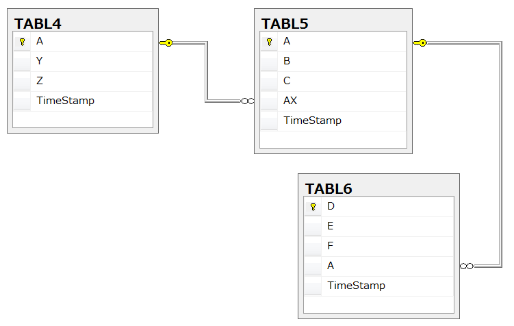 Table name, column information - TABL4,A, ,Y,Z,TimeStamp, TABL5,A, ,B,C,AX,TimeStamp, TABL6,D, ,E,F,A,TimeStamp,