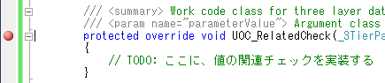My3TierEngineclass as follows. The point isUOC_RelatedCheckmethod for implementing relation check. By implementing relation check program in this method, relation check can be executed before updating the table. (This tutorial describes the implementing position only, and does not describe how to implement relation check.)public class My3TierEngine : _3TierEngine { /// <summary>Constructor</summary> public My3TierEngine() { // TODO: Add the constructor logic here } #region Fixed execution /// <summary>Call base</summary> /// <param name="parameterValue">Argument class</param> protected override void UOC_SelectRecord(_3TierParameterValue parameterValue) { base.UOC_SelectRecord(parameterValue); } /// <summary>Call base</summary> /// <param name="parameterValue">Argument class</param> protected override void UOC_UpdateRecordDM(_3TierParameterValue parameterValue) { base.UOC_UpdateRecordDM(parameterValue); } /// <summary>Call base</summary> /// <param name="parameterValue"> Argument class </param> protected override void UOC_DeleteRecordDM(_3TierParameterValue parameterValue) { base.UOC_DeleteRecordDM(parameterValue); } /// <summary>Call base</summary> /// <param name="parameterValue"> Argument class </param> protected override void UOC_BatchUpdateDM(_3TierParameterValue parameterValue) { base.UOC_BatchUpdateDM(parameterValue); } #endregion /// <summary> Work code class for three layer data bind related check </summary> /// <param name="parameterValue"> Argument class </param> protected override void UOC_RelatedCheck(_3TierParameterValue parameterValue) { // TODO: ここに、値の関連チェックを実装する } }
