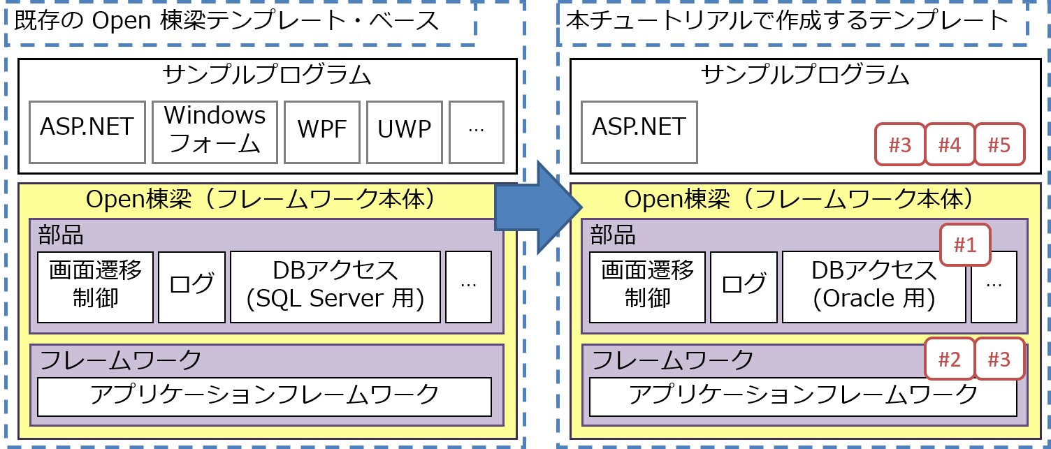 本チュートリアルでは、図 3-1 のように、既存の Open 棟梁テンプレート・ベースから、DBMS に Oracle を用いた、Web 2 層 (ASP.NET) アプリケーション向けテンプレートを作成する形で演習を行います。Open 棟梁テンプレートの作成手順を表 3-1 に示します。