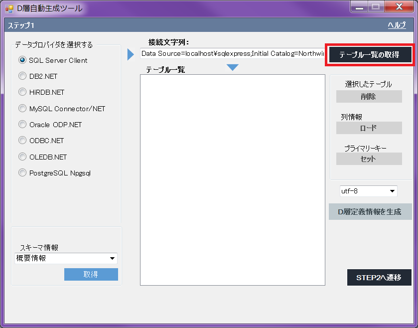 「テーブル一覧の取得」ボタンをクリックします。
