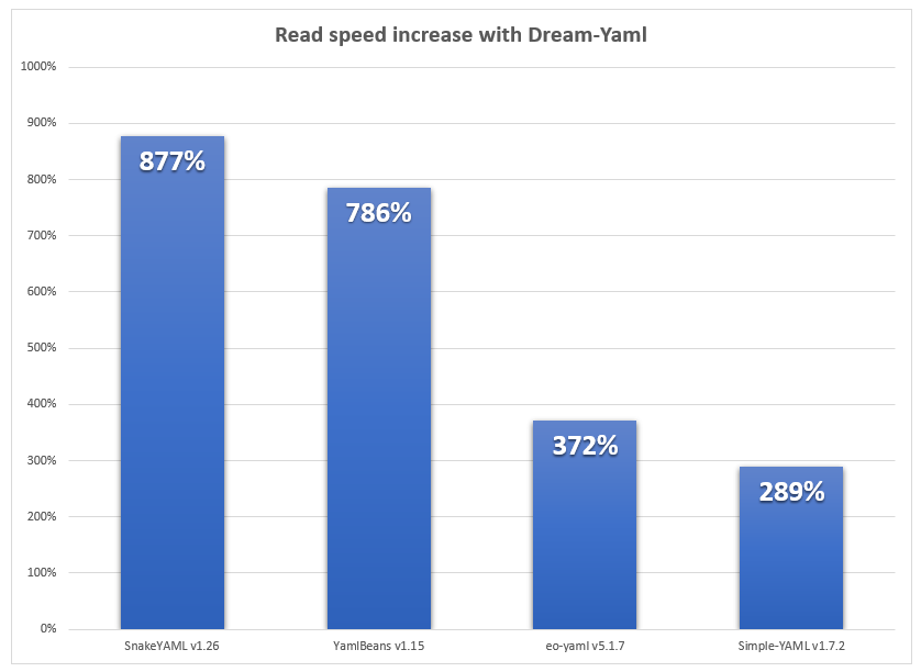 Dream-Yaml seems to be about 9x faster than SnakeYAML , 8x faster than YamlBeans , 4x faster than eo-yaml and 3x faster than Simple-Yaml.