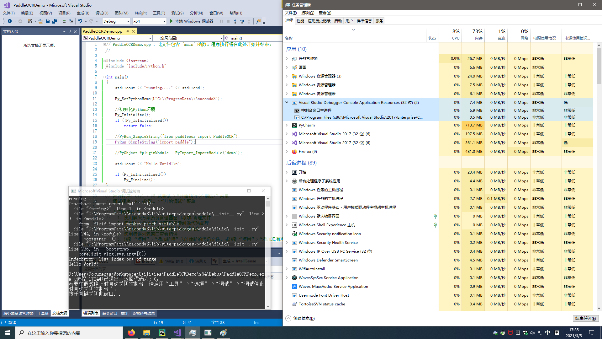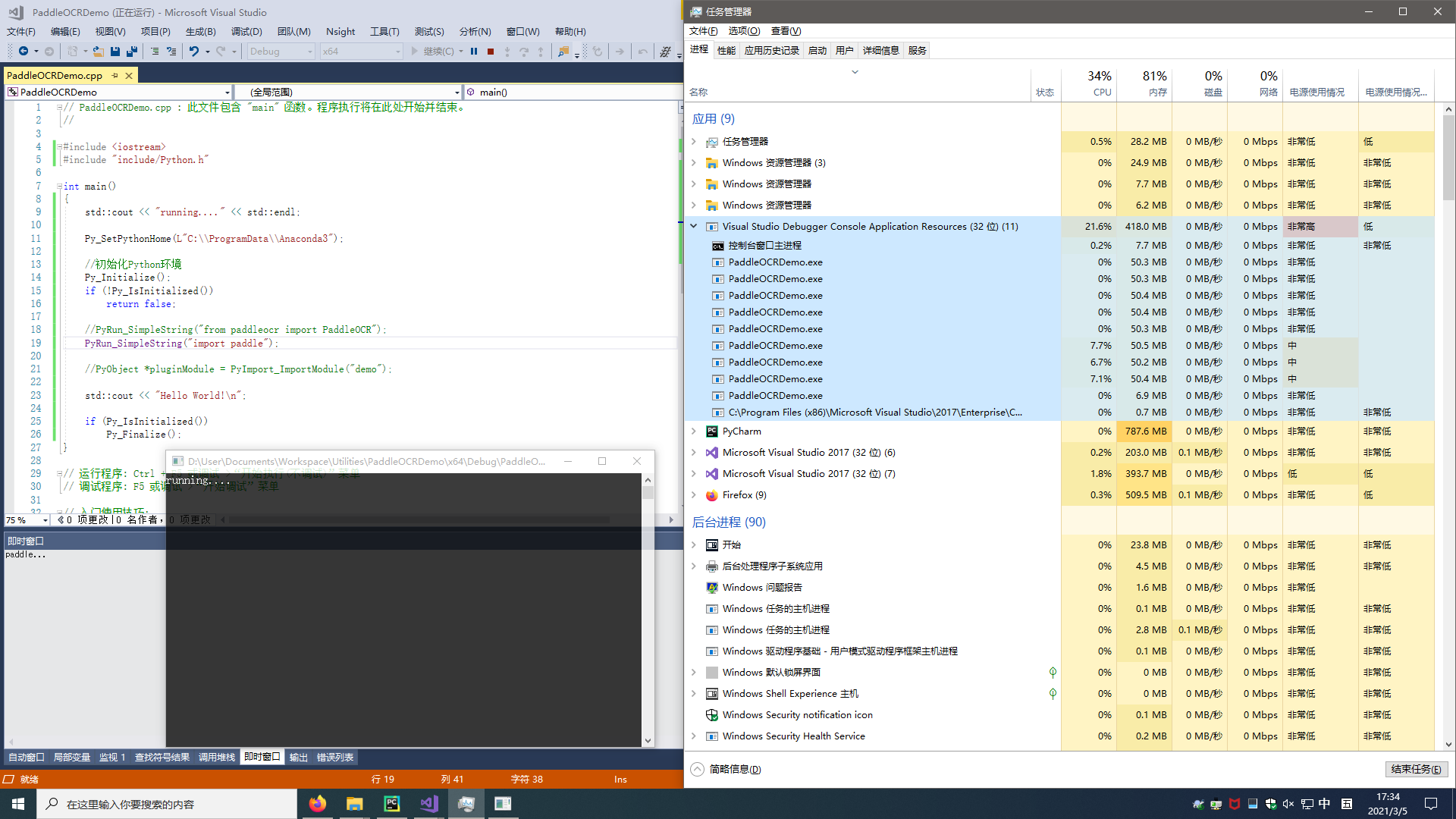 - 问题描述:执行时间很长,并且后台在反复运行当前程序直到崩溃,无论是直接引用带Import paddle 的py文件,还是直接在c++ 中使用PyRun_SimpleString("import paddle") ,都会复现,请看下图。