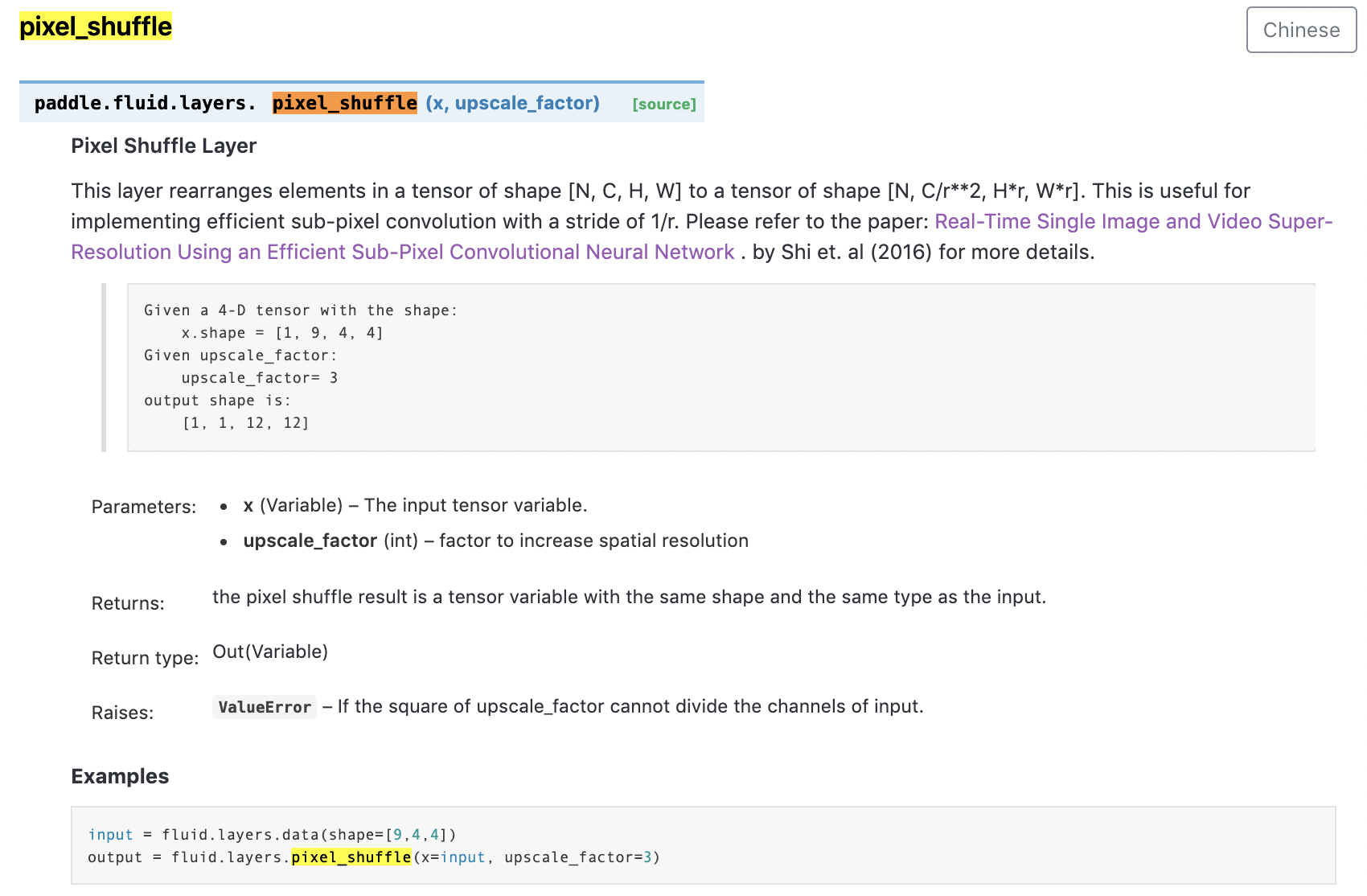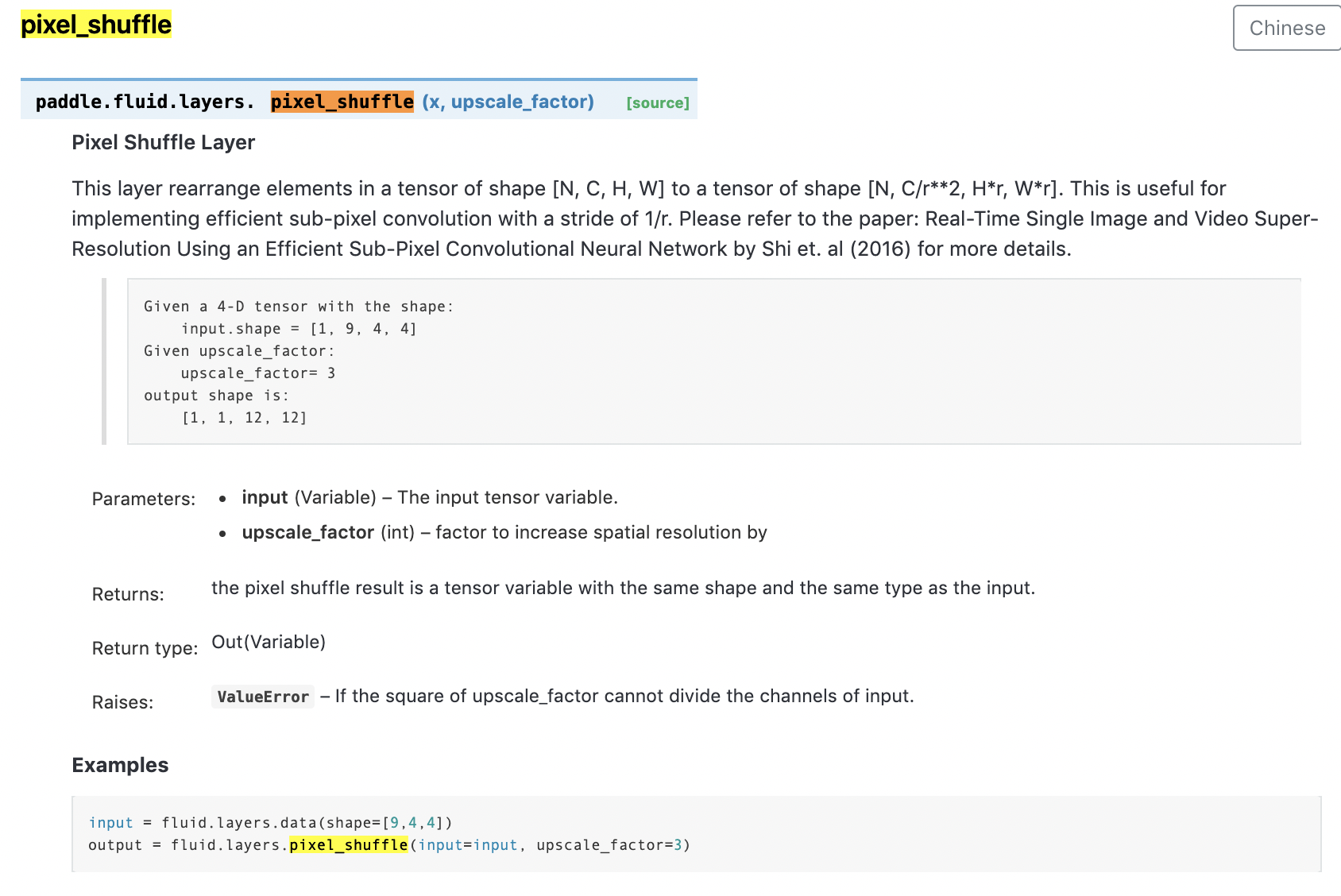 Pixel shuffle rearranges elements in a tensor of shape [N, C, H, W] to [N, C / r^2, H * r, W * r], which r is an upscale_factor.