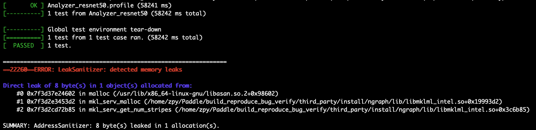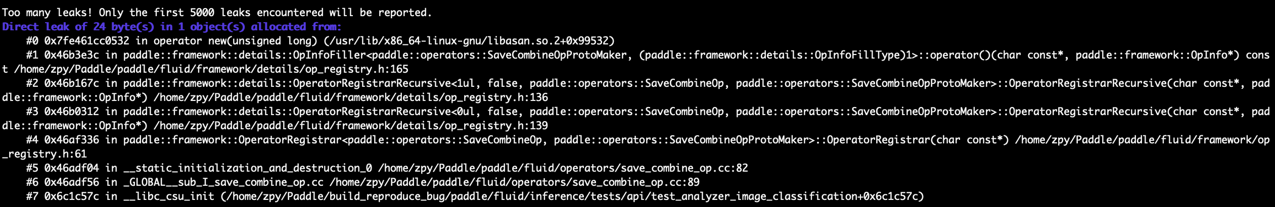 @luotao1 In short, fix solves the issue below: SUMMARY: AddressSanitizer: 209193 byte(s) leaked in 8511 allocation(s). |