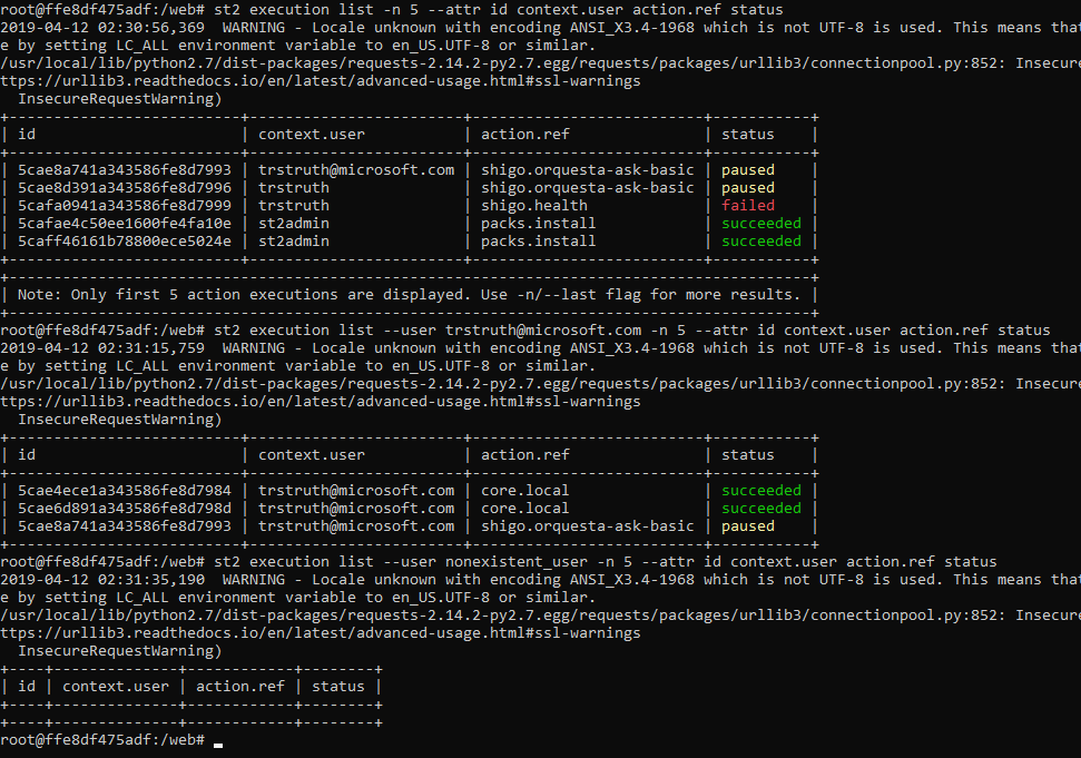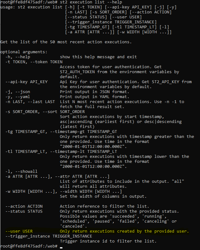 st2 execution listcli command doesn't expose a--userfilter, despite the fact that st2client accepts auserkwarg forst2client.client.executions.get_all(). This changes that.