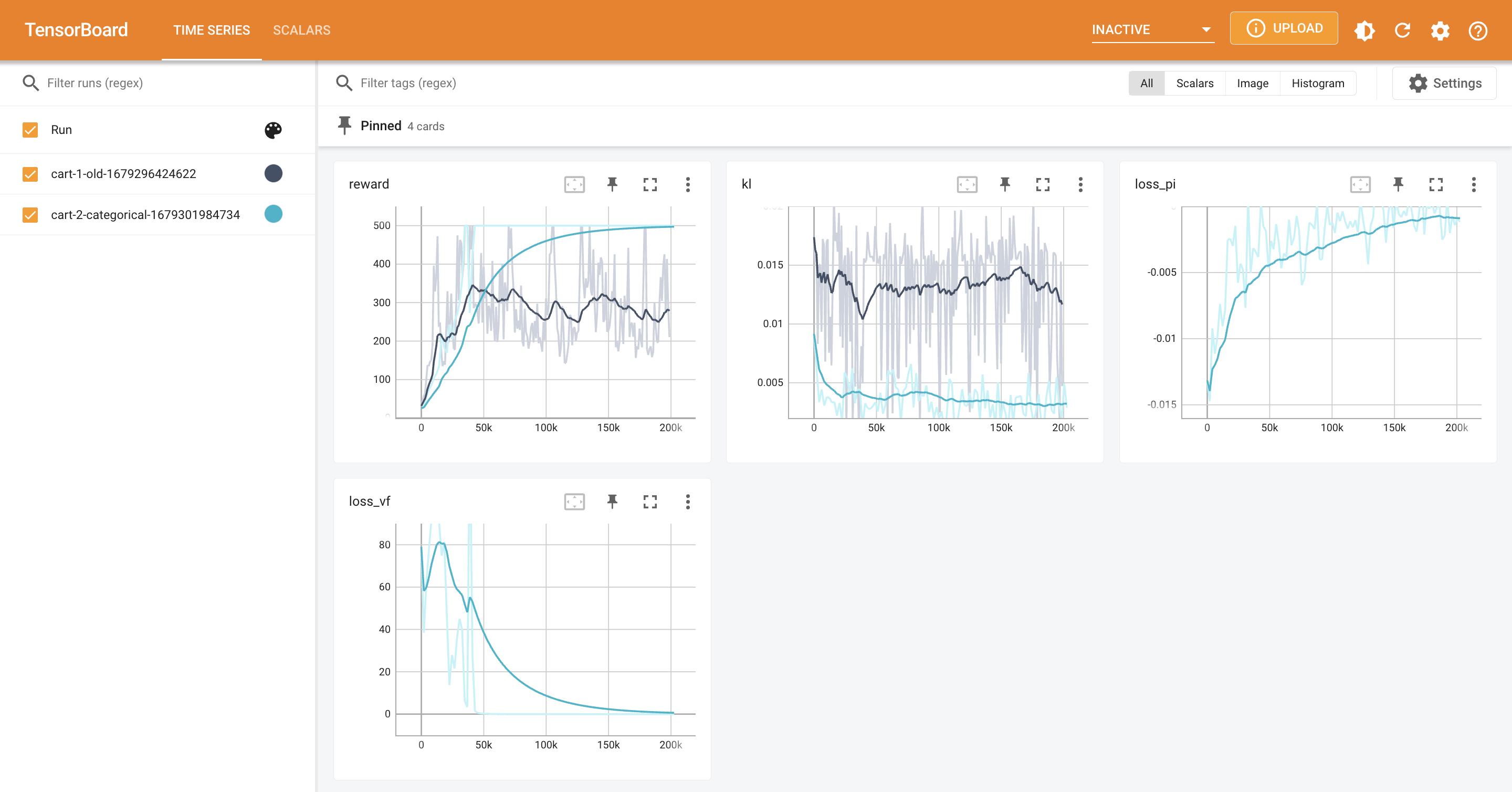 rl-tsPPO algorithm better and closer to the sb3 implementation:Categoricaldistribution andMLPCategoricalActor, and use it for environment with discrete action spacebatch_sizeforn_epochsin each iteration, instead of fixed number of iterations per epochOverall, the PPO implementation is more stable (lower KL and not hitting max KL limit) and performs better (able to reach optimal reward for cartpole within 50k steps).