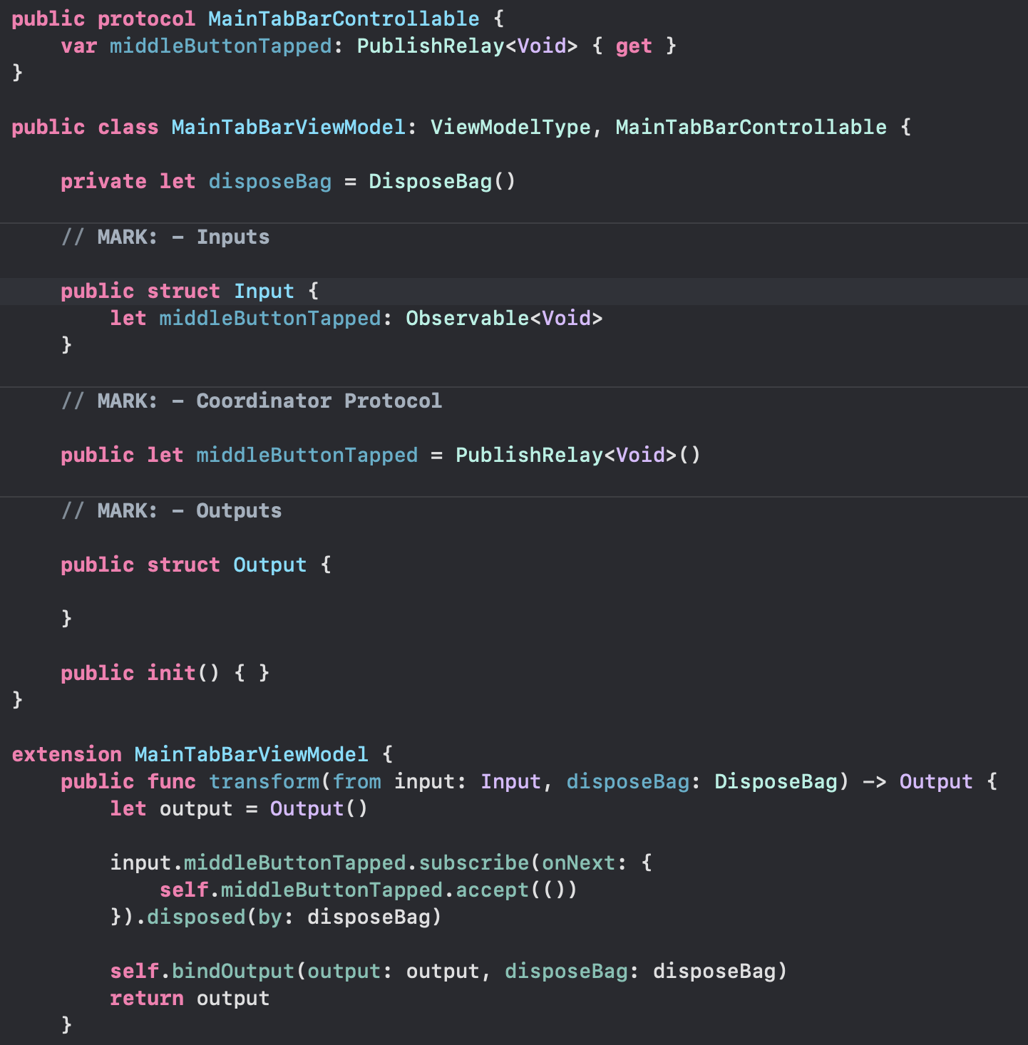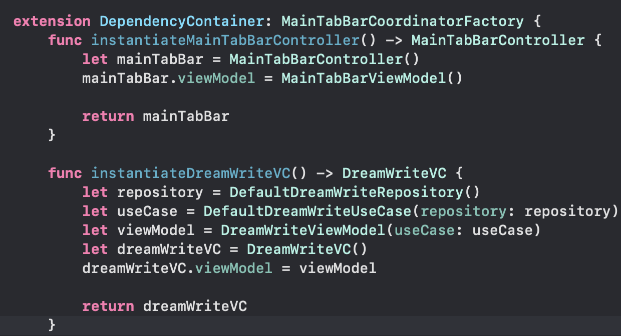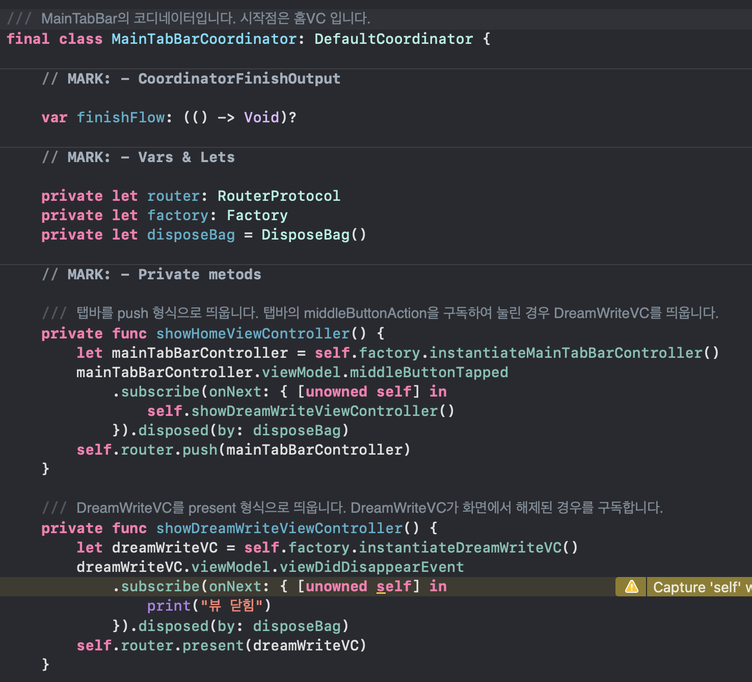 AppCoordinator와MainTabBarCoordinator입니다.AuthCoordinator정도인 것 같습니다. 이유는 뎁스가 2이상인 플로우가 없기 때문에 MainTabBarCoordinator에서 각 화면으로의 화면전환을 모두 담당할 수 있기 때문입니다.Coordinator는ViewModel의PublishRelay를 구독하여 이벤트가 들어오면 화면전환을 진행합니다.showHomeViewController()에서 뷰모델의 middleButtonTapped를 구독하고, 이벤트가 들어온 경우 DreamWriteVC를 띄워주고 있습니다.showDrreamWriteViewController()에서는 viewDidDisappear를 구독하여 화면이 dismiss됨을 코디네이터가 알아차릴 수 있습니다.뷰모델에서는 VC의 action을 구독하여 자신이 가진