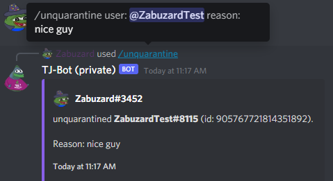 /quarantineand/unquarantinecommands. They act mostly as preparation for #394 , but should also aid as help for mods and staff to manually resolve situations.Quarantining is similar to muting, but will have subtle differences in how it is handled in the server, permission-wise. For example, a quarantined user might only be given access to a special