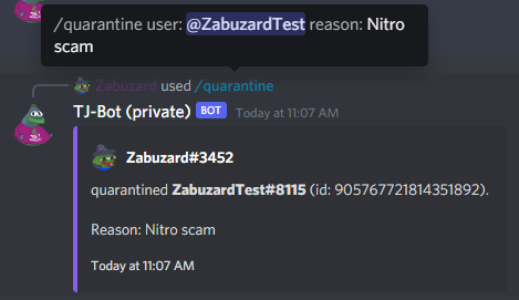 #quarantine_zonechannel, where he can talk to the moderators. Also, they will have less permissions than muted users, for example not being able to view any other channel anymore.Quarantines are permanent, but the code supports temporary quarantines as well (this will be interesting for the scam blocker).