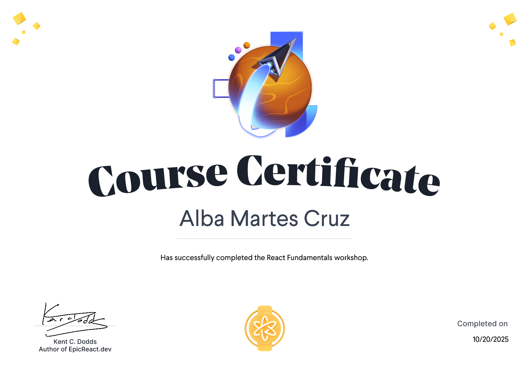 [x] React Fundamentals β Completed on 10/20/2025 (View Certificate)