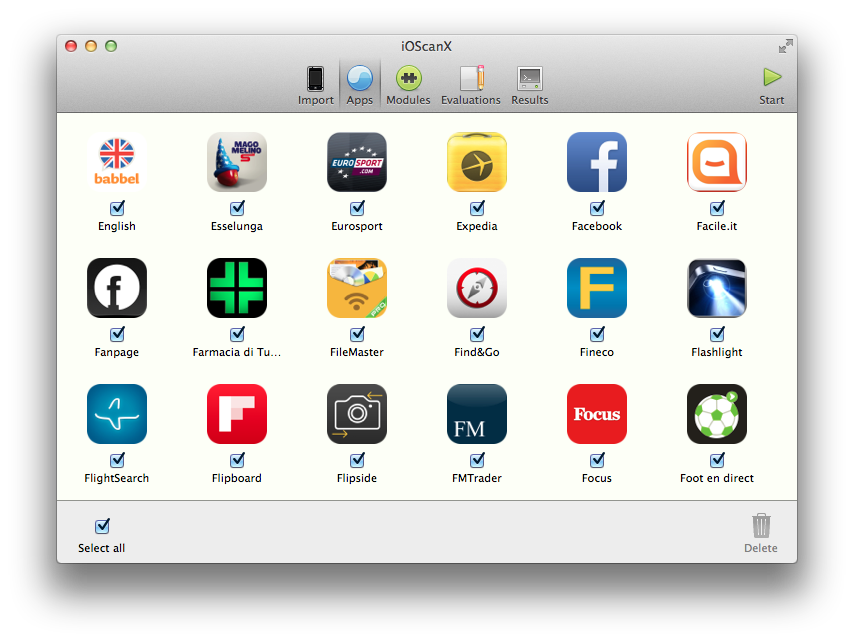 the first step is the acquisition of a group of applications that are going to be the subject of the scanning. iOScanX is capable of automatically decrypting and importing apps from a jailbroken device, connected via SSH through USB or Wi-Fi;
