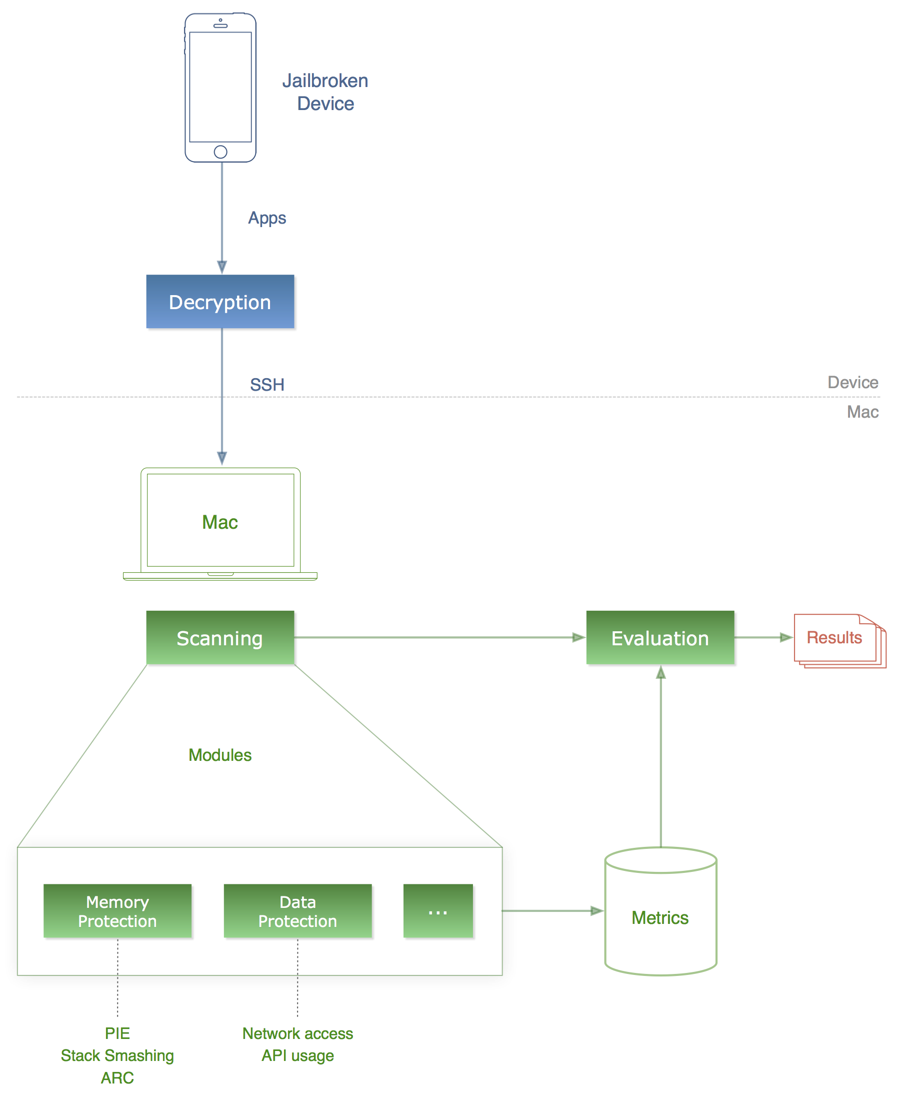 iOScanX is the highest level part of the eponymous project. It takes advantage of the ScanX framework in order to actualize a practical workflow for iOS application scanning.