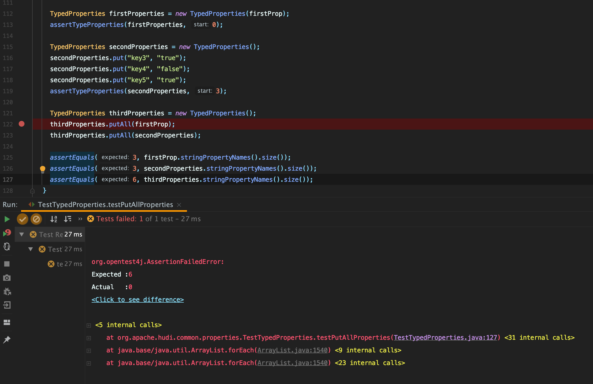 Java 11: Properties overwrite putAll method, and delegate the incoming map to ConcurrentHashMap. It won't call TypedProperties.put method anymore, which lead the TypedProperties.keys fields miss some keys, and then it cause that we miss the hoodie.index.type configuration.