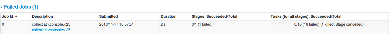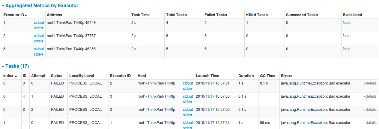 sc.parallelize(1 to 10000, 10).map{ x => throw new RuntimeException("Bad executor")}.collect()