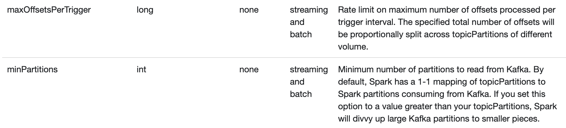 | You can configure Spark to use an arbitrary minimum of partitions to read from Kafka using the minPartitions option. | ||