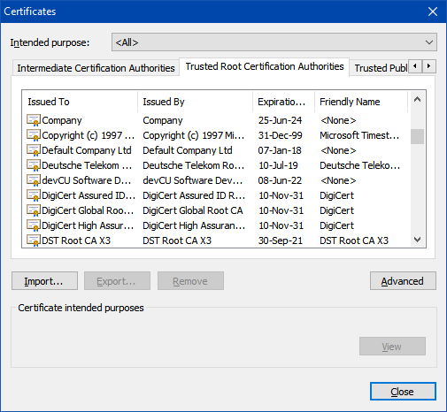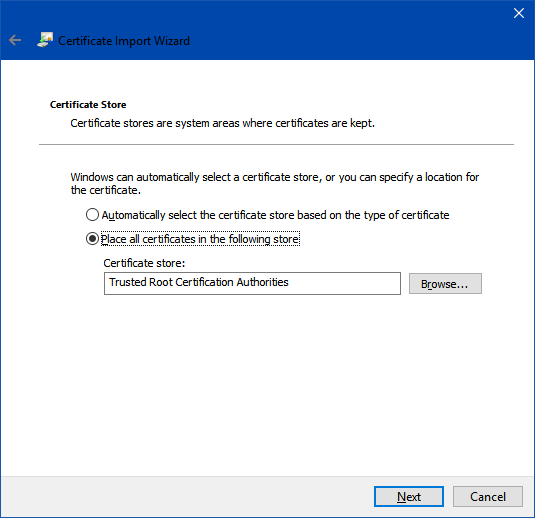 Click on import, and select the certificate file we created earlier. Select place all certificates in the following store