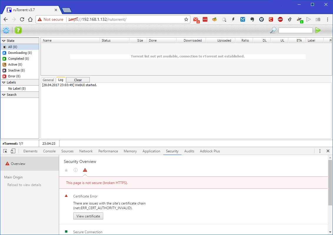 Once you proceed your rutorrent window should open, click SHIFT-CTRL-i (or F12) and the developer tools console will open, select the security tab, and you should see something like this