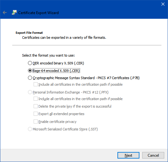 click copy to file, click next and select Base-64 option