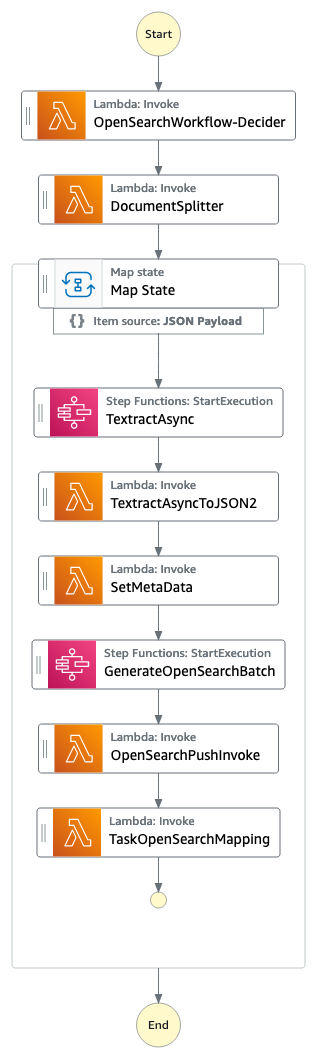 cdk deploy OpenSearchWorkflowThe workflow first splits the document into chunks of max 3000 pages, because that is the limit of the Textract service for asynchronous processing. Each chunk is then send to StartDocumentAnalysis extracing the OCR information from the page. The meta-data added to the context of the StepFunction workflow includes information required for creating the OpenSearch bulk import file, including ORIGIN_FILE_NAME and START_PAGE_NUMBER.