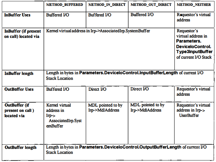 - The Method argument indicates to the I/O Manager how the data buffers supplied with this request are to be described (METHOD_BUFFERED, METHOD_IN_DIRECT and METHOD_OUT_DIRECT, METHOD_NEITHER).
