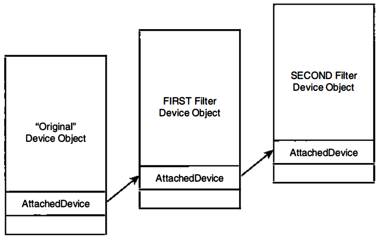 IoGetDeviceObjectPointer (). The Filter driver then attaches its Device Object to the found Device Object using theIoAttachDeviceToDeviceStack ()function. - Every Device Object has a field named AttachedDevice, which points to the Device Object of the first Filter driver that has attached this Device Object. If the AttachedDevice field of the Device Object is NULL, there are no attached devices. If the AttachedDevice field is not-zero, it points to a Filter driver's Device Object.