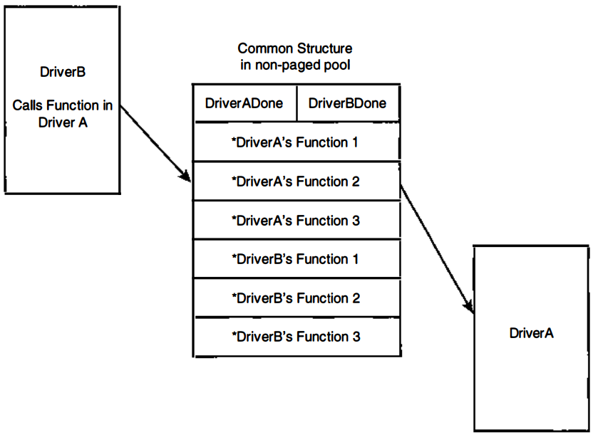 IoCallDriver ()from its Completion routine to pass the IRP to the underlying driver. Although this might initially sound like a good idea, this can result in stack overfiow problems. Also recall that Completion routines may be called at any IRQL <= DISPATCH_LEVEL . BecauseIoCallDriver ()results in a target driver's Dispatch routine being called directly, this also results in the target driver's Dispatch routine being called at IRQL DISPATCH_LEVEL . This is likely to be a fatal error, resulting in a system crash, because most drivers expect their dispatch routines to be called at IRQL PASSIVE_LEVEL or IRQL APC_LEVEL . To avoid these problems, Completion routines should send the IRP to a worker thread running at IRQL PASSIVE_LEVEL. The worker thread can then callIoCallDriver ()to resubmit the IRP to the underlying driver. - The simplest way that two drivers can communicate is to simply call each other's routines directly. Because all drivers reside within the system process' address space. On loading, each driver creates and initializes a structure into which it places pointers to the entry points it wishes to export to the other driver, and calls a function in a DLL to store this information. When one driver wishes to call the other, it simply does so through a set of functions provided by the DLL, which calls the appropriate function through one of the previously provided pointers.