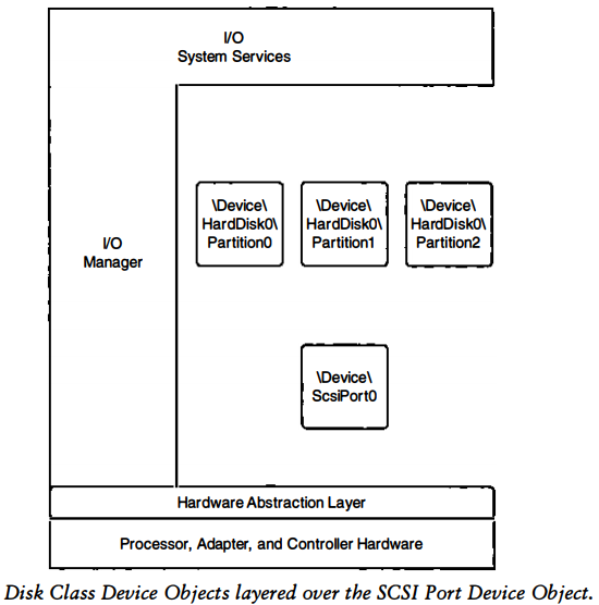 IoGetDeviceObjectPointer (). This resuls on the refrence count of the Device Object to which the File Object belongs to get incredemented. It gets decremented when the Class driver callsObDereferenceObject ()on the File Object. - Next, the Disk Class driver enumerates the device units on each SCSI Port. For each disk fund, the Disk Class driver creates a Device Object named \Device\HardDiskX\Partition0 (where x is the ordinal number of the disk). This Device Object represents the (entire raw) disk volume itself. In addition, the Disk Class driver creates one Device Object for each logical partition on the disk with a format that it can identify as supportable under Windows NT. These Device Objects are named