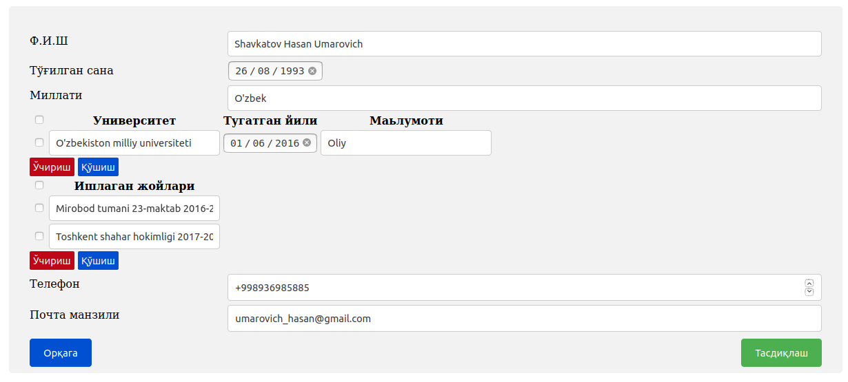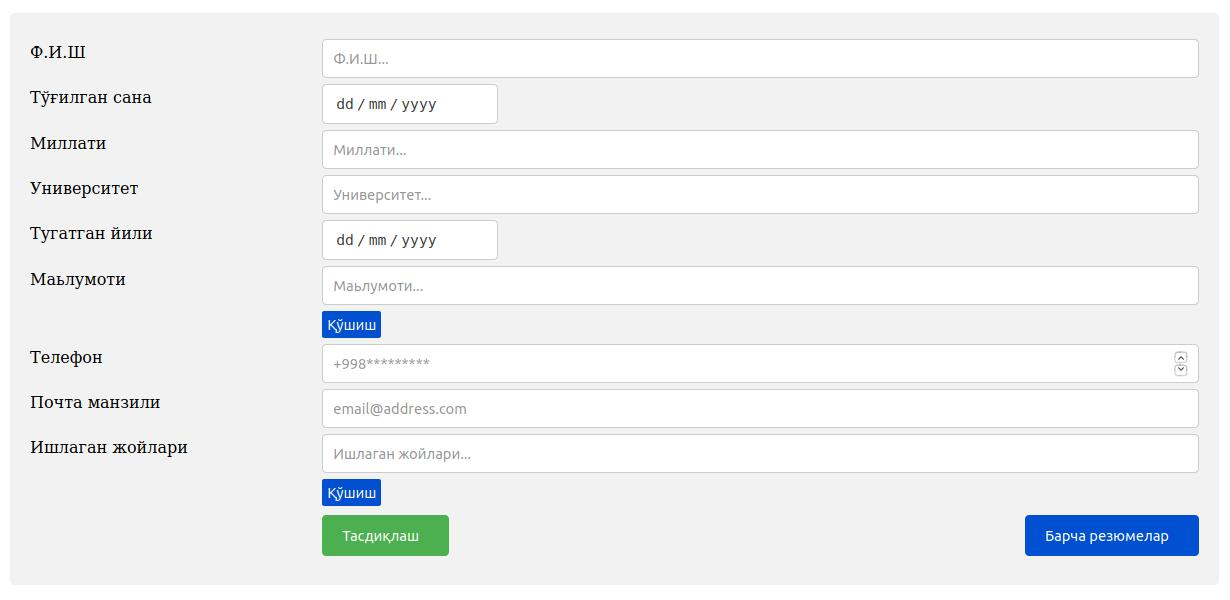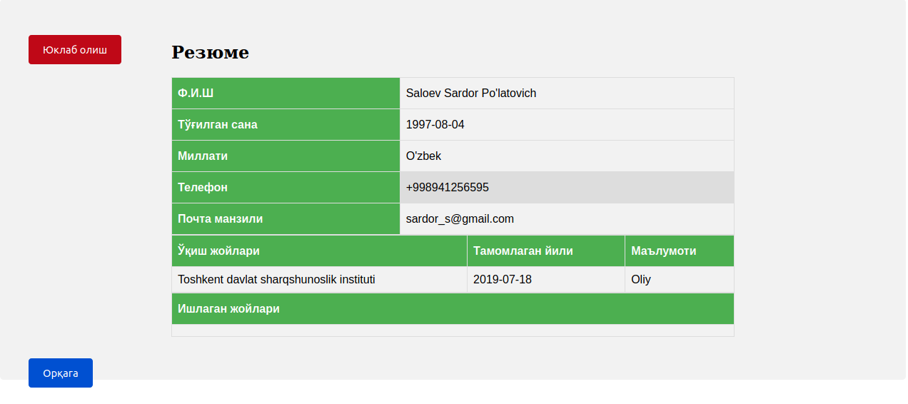 with this project you can save information about your employees to the datebase, and also you may modify, edit and delete from database(CRUD). If you need individual employee information, you can download them in pdf format.