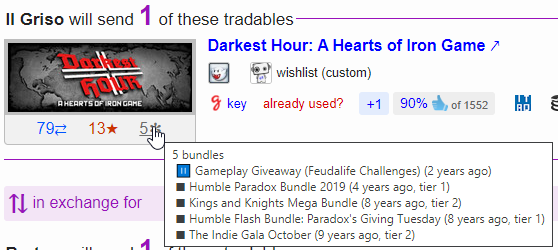 Getting familiar with this aspect of Barter.vg will help you enormously to avoid falling for an offer that someone looking to take advantage of your lack of experience will send you. Keep a close eye on past or recent Humble Choice games, as the number of tradables will explode at the start of every month, with grey market prices dipping as low as 30 or 40 cents, and copies available on Barter.vg inflating to as many as 200-500. Other recent bundles would be good to keep an eye on, but they don’t have nearly the same fluctuation in value that accompanies Humble Choice games.