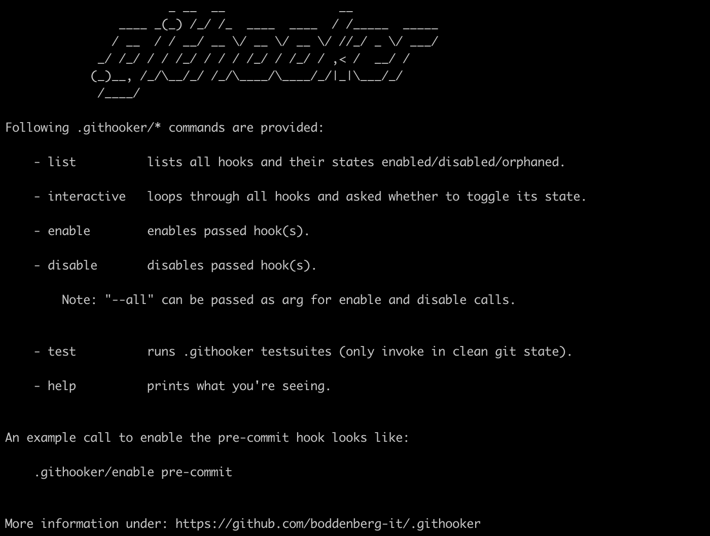 Moreover, .githooker provides commands to simply manage git-hooks in an interactive CLI manner. The following output of .githooker/help shows/explains all available commands: