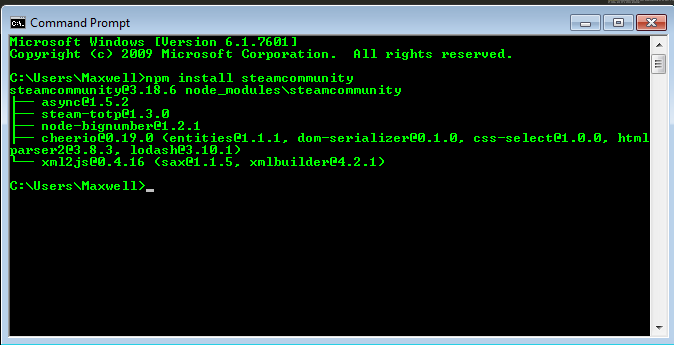 2. Installing node.js will also install npm, a package manager for node. This will make installing the packages super easy. To install the packages we need for the bot, type npm install packagename into command prompt. To start, we need steamcommunity and steam-tradeoffer-manager, written by DoctorMcKay. Open up command prompt (Start Menu -> cmd), navigate to where you want it installed (I did it in C://Users/Maxwell just because that's where my cmd starts, I recommend doing it in your login's main directory too.) Type npm install steamcommunity, wait for it to finish, and then do npm install steam-tradeoffer-manager
