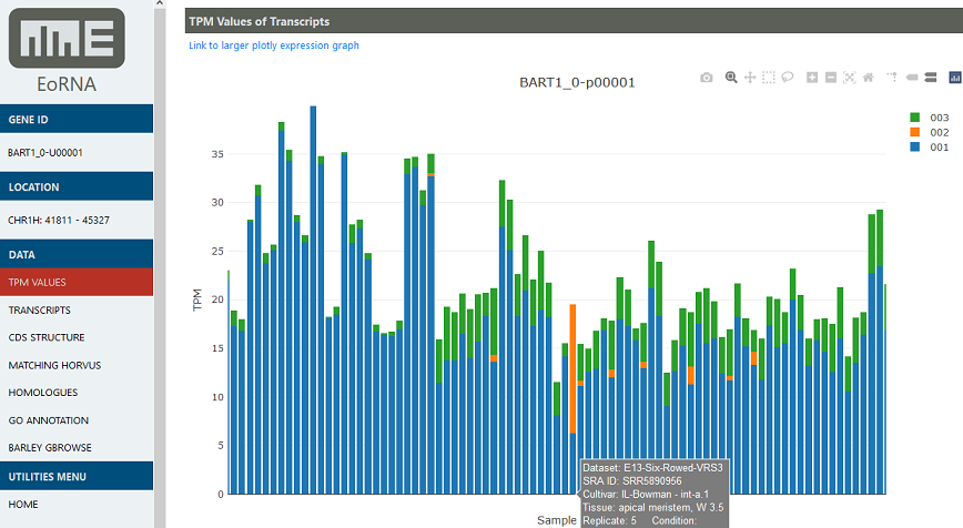 The EORNA website is designed to store and visualize gene and transcript abundance data on demand as transcripts per million (TPM) across all samples and all the genes within the barley genome. Abundances of alternative transcript expression for a gene are displayed as a Manhattan plot using Plotly.
